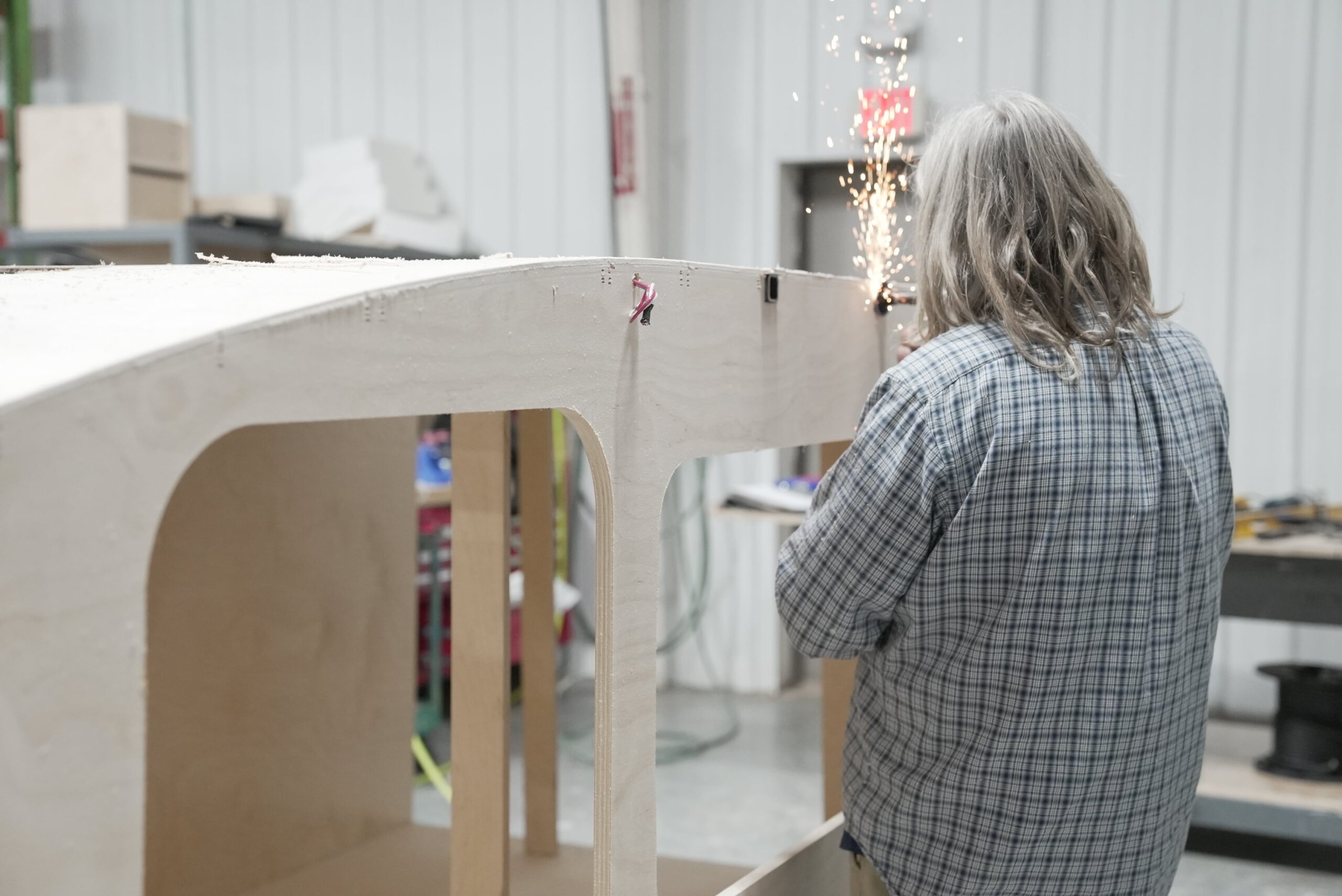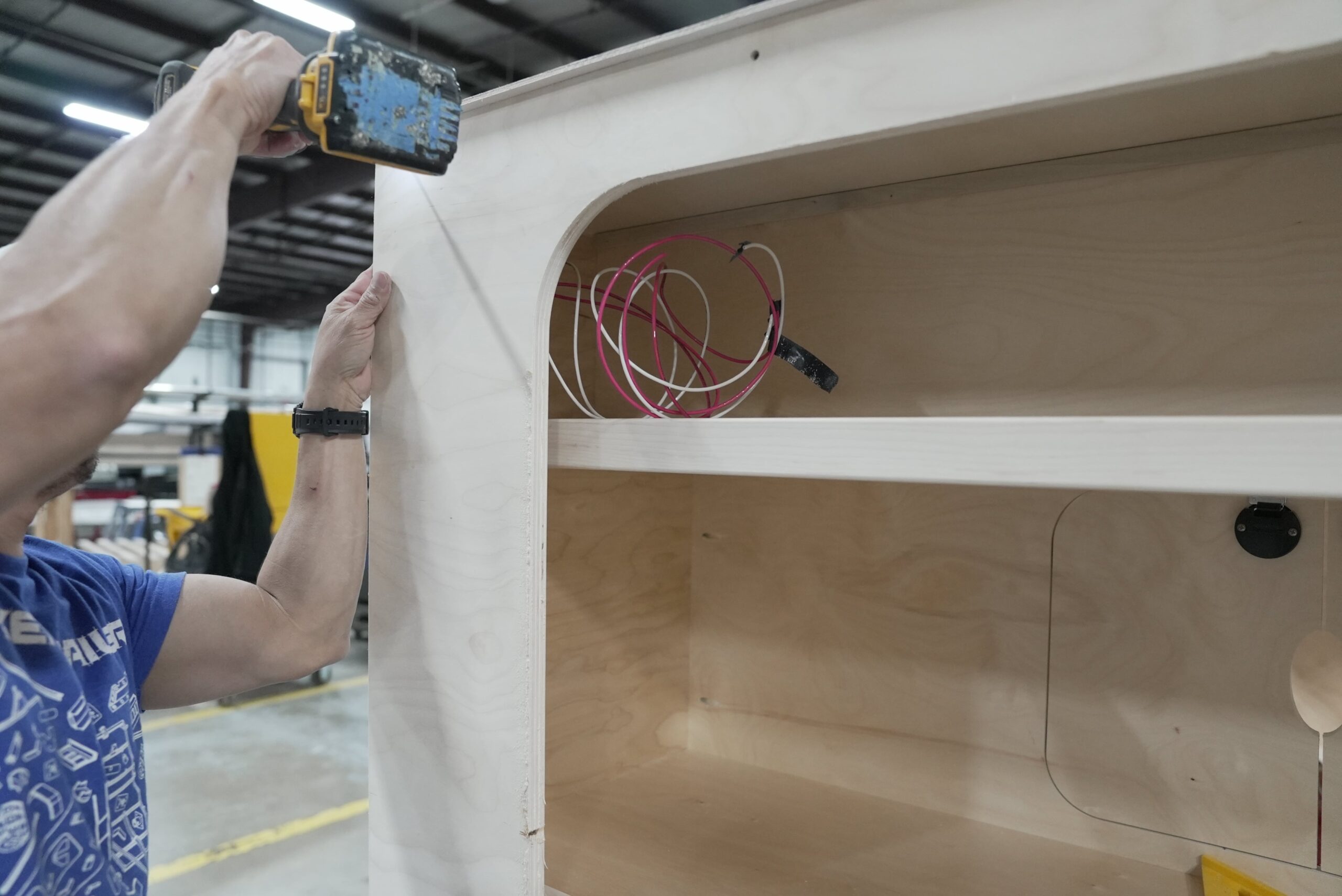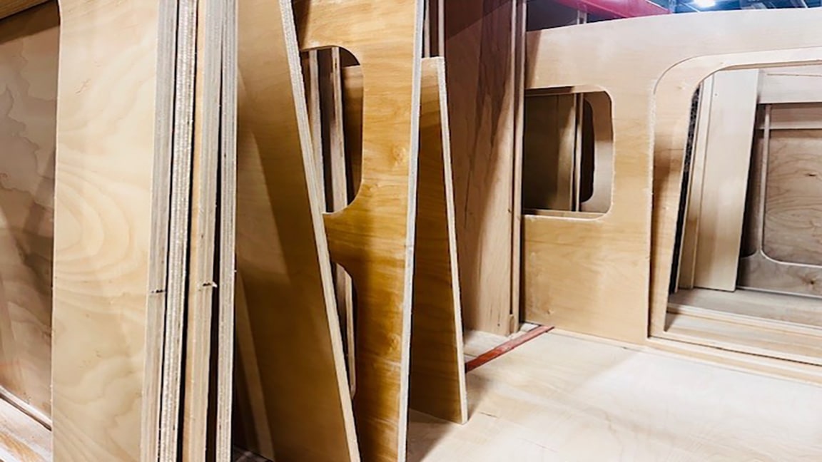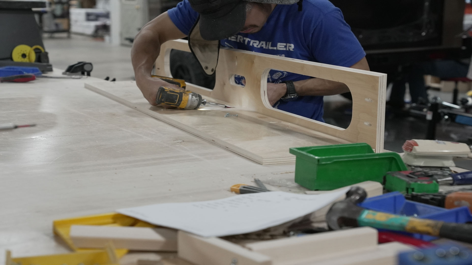 The woodworking station is where beauty meets function. Here, experienced craftsmen install and finish all cabinetry, blending elegance with practicality. Precision CNC cut and hand finished cubbies, drawers, shelves, and trim add to the form and function of each unique Hiker Trailer set up.